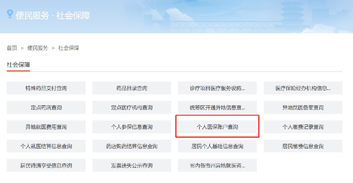 登录后进入首页页面,在【便民服务】栏目里点击【社会保障】,再进入【医保查询】页面,然后点击【个人医保账户查询】即可查询个人账户收支明细、账户余额等。